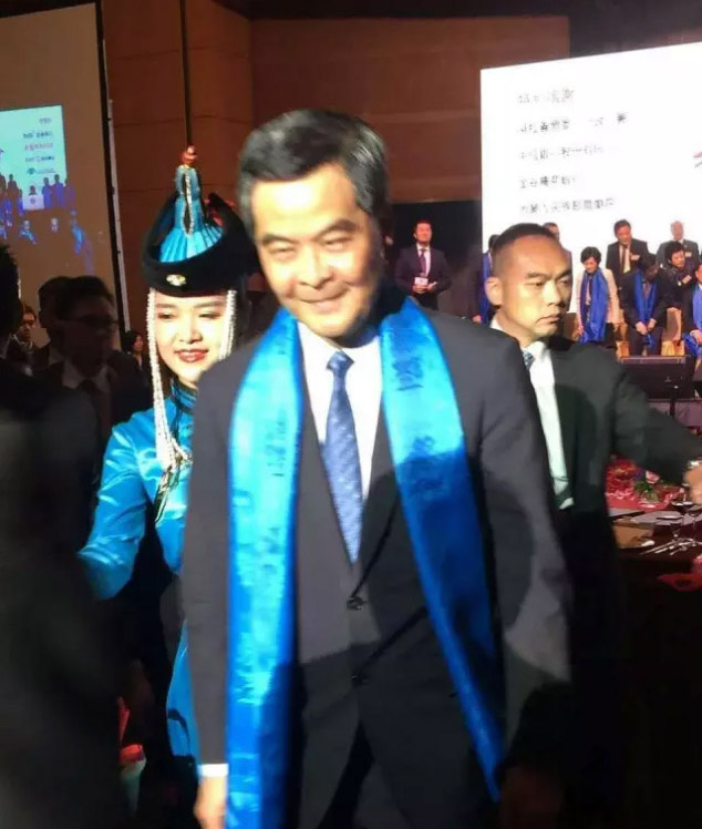 (前排左四為內蒙古自治區(qū)主席布小林、左五為香港特首梁振英、左六為香港內蒙古工商聯(lián)合總會會長陳建文)
